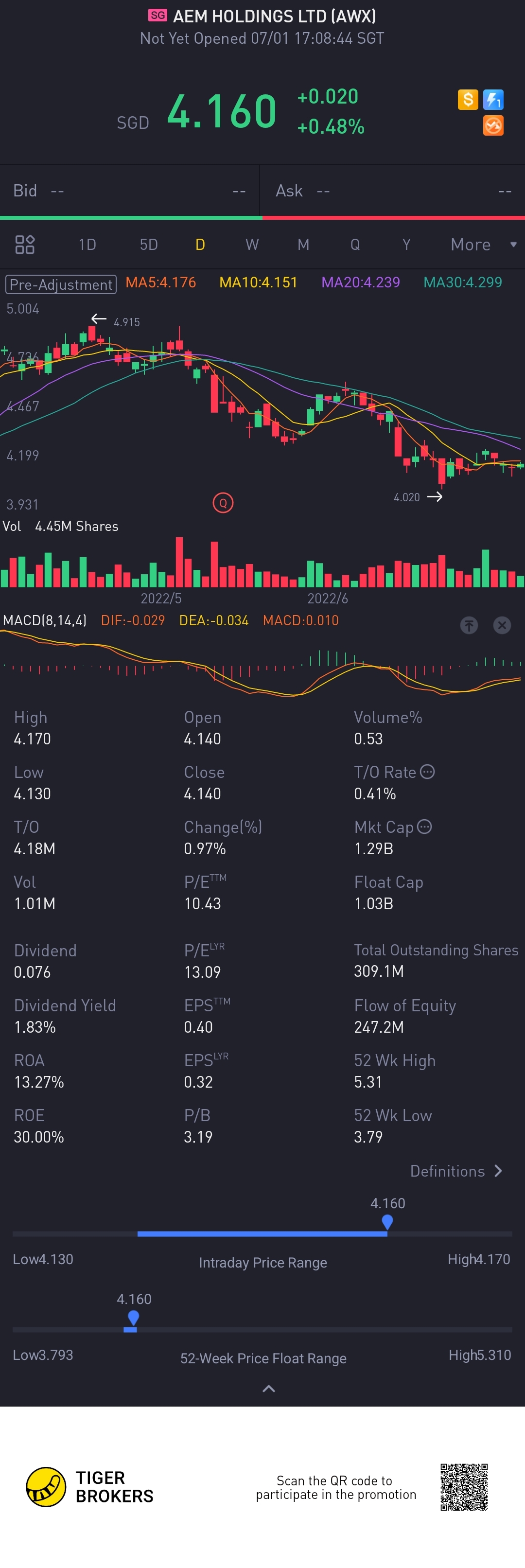 $AEM HOLDINGS LTD(AWX.SI)$ not much movement last week.... has AEM found its support at this price range? Lets see .....