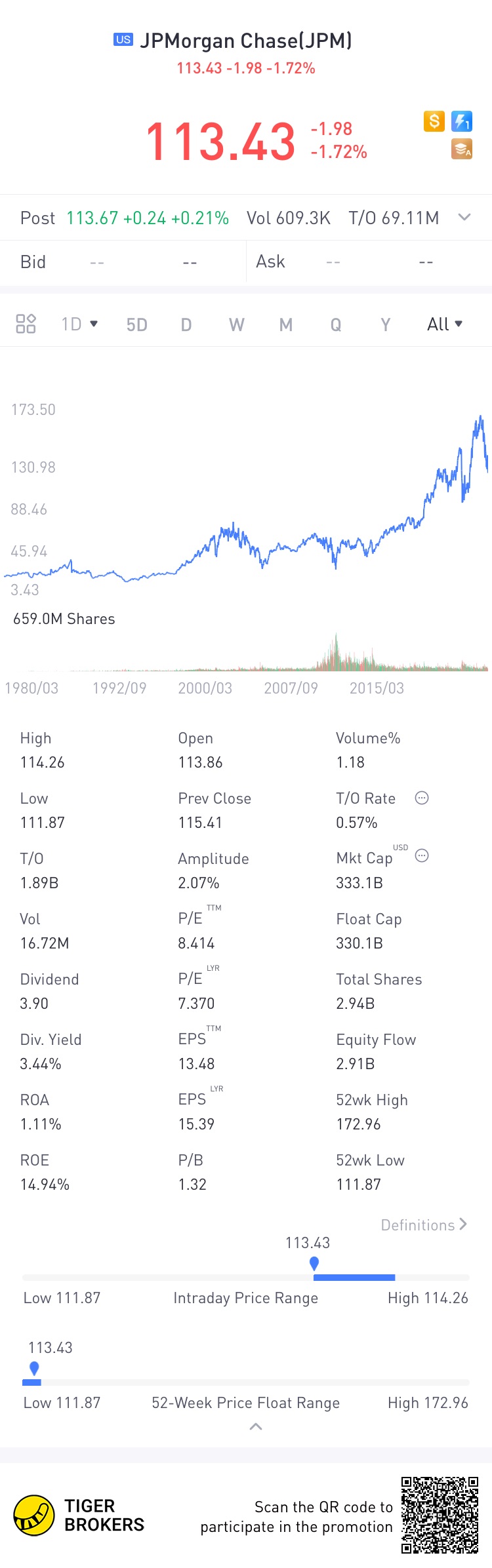 $JPMorgan Chase(JPM)$operates as a financial services company worldwide. Has 4 segments: Consumer & Community Banking, Corporate & Investment Bank, Commercial Banking & Asset & Wealth Management