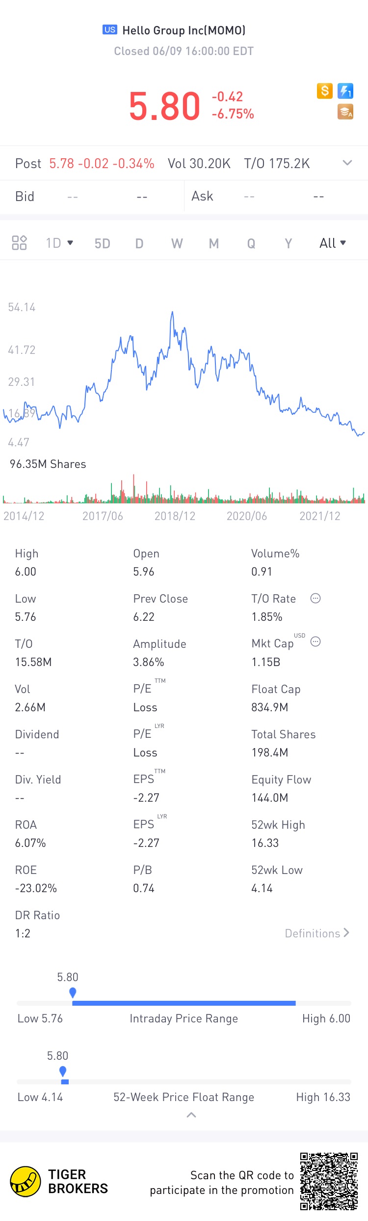 $Hello Group Inc(MOMO)$provides mobile-based social and entertainment services in China. Its mobile application connects people and facilitates interactions based on location and interests.