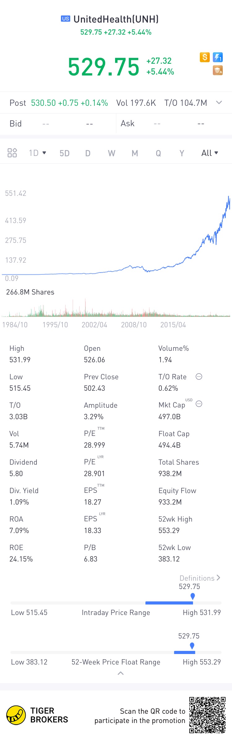 $UnitedHealth(UNH)$operates as a diversified health care company in USA. It operates through 4 segments: UnitedHealthcare, Optum Health, Optum Insight, and Optum Rx. The UnitedHealthcare segment offers consumer-oriented health benefit plans and services for national employers, public sector employers, mid-sized employers, small businesses, and individuals; health care coverage and well-being services to individuals age 50 and older addressing their needs for preventive and acute health care services, as well as services dealing with chronic disease and other specialized issues for older individuals; Medicaid plans, children's health insurance and health care programs; health and dental benefits; and hospital and clinical services. The OptumHealth segment provides access to networks of care provider specialists, health management services, care delivery, consumer engagement, and financial services. This segment serves individuals directly through care delivery systems, employers, payers, and government entities. The OptumInsight segment offers software and information products, advisory consulting arrangements, and managed services outsourcing contracts to hospital systems, physicians, health plans, governments, life sciences companies, and other organizations. The OptumRx segment provides pharmacy care services and programs, including retail network contracting, home delivery, specialty and compounding pharmacy, and purchasing and clinical capabilities, as well as develops programs in the areas of step therapy, formulary management, drug adherence, and disease/drug therapy management.