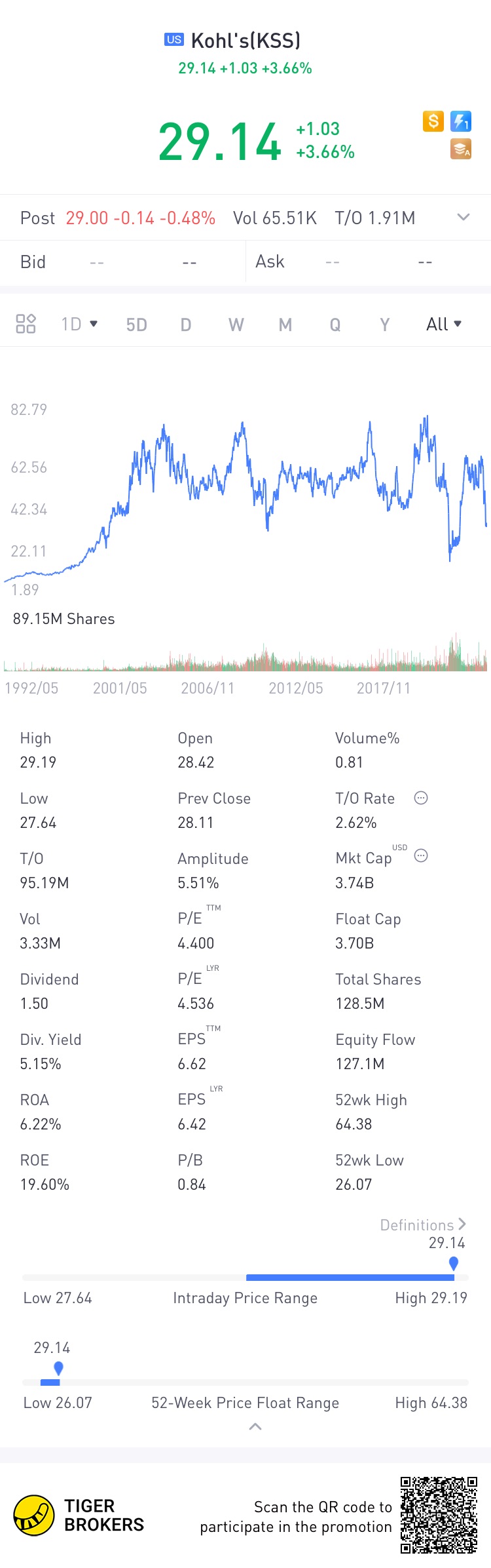 $Kohl's(KSS)$operates as a retail company in the United States. It offers branded apparel, footwear, accessories, beauty, and home products through its stores and website. The company provides its products primarily under the brand names of Apt. 9, Croft & Barrow, Jumping Beans, SO, and Sonoma Goods for Life, as well as Food Network, LC Lauren Conrad, Nine West, and Simply Vera Vera Wang. As of March 21, 2022, it operated approximately 1,100 Kohl's stores and a website www.Kohls.com.