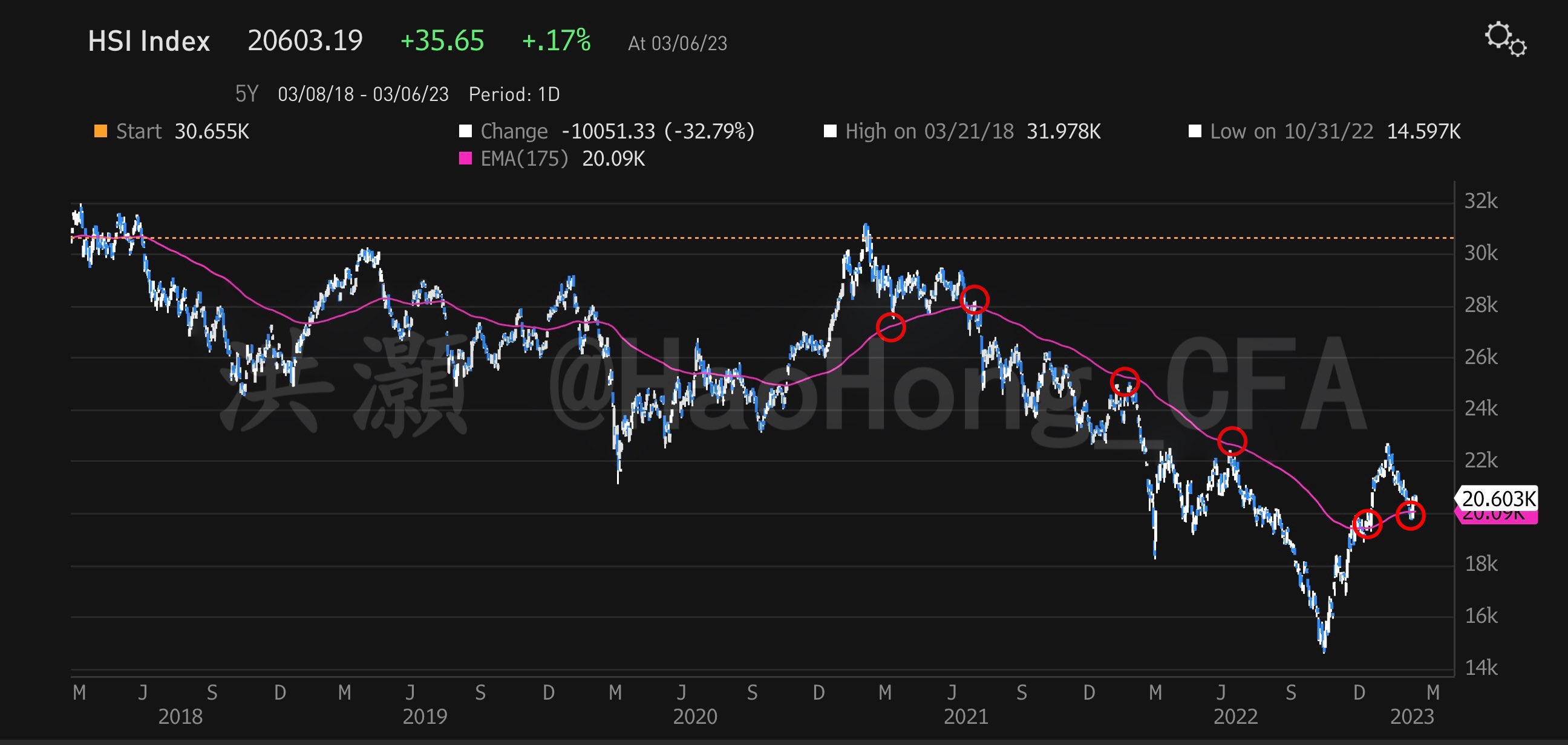 The Hang Seng $HSI(HSI)$ bounced off its 850-cycle line again, despite a “weak” GDP target set by the NPC and the imminently hawkish Powell.