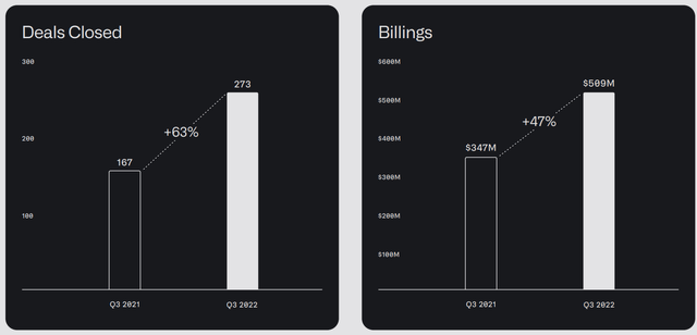 Palantir grew its consolidated revenues 22% year over year to $477.9B in Q3'22 and the software analytics company guided for more than half a billion in Q4'22 revenues for the first time ever. Palantir also closed 106 new deals in the last twelve months (mostly with new customers), 78 of which were closed just in the third-quarter and nineteen of those had a deal value in excess of $10M. The firm's total deal volume (as of September 30, 2022) was $4.1B, showing 14% year over growth. Customers continue to flock to Palantir's Foundry solutions which help company's centralize, streamline and analyze their large data sets and as long as Palantir continues to grow its customer base and deal value, I believe the software firm is on a good path towards profitability.