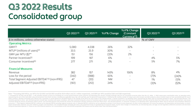 While we continue to view Grab Holdings Limited (NASDAQ:GRAB) as a highly speculative investment, we continue to see the company making progress towards profitability after it reportedthird quarter results. Year-over-year group revenuewas up over 140%, and loss for the period improved substantially. Monthly transacting users also grew 30% y/y, accelerating significantly from the previous two quarters.