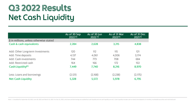 Grab ended the third quarter with $7.4 billion of gross cash liquidity, with cash liquidity declining by $291 million from the end of the second quarter of 2022. Net cash liquidity was $5.3 billion as of the end of the third quarter. The company shared that right now cash preservation is top of mind for them.