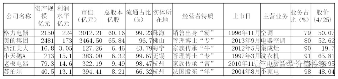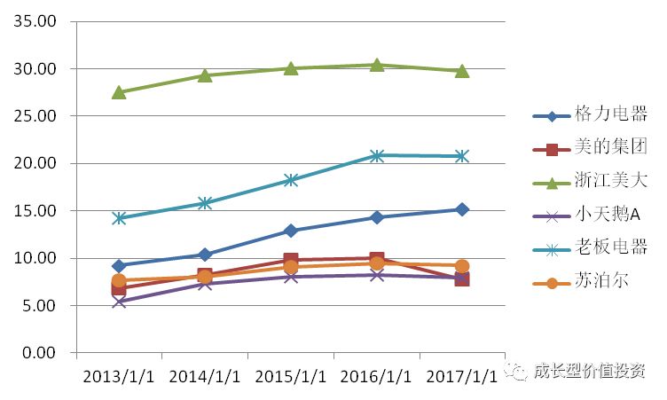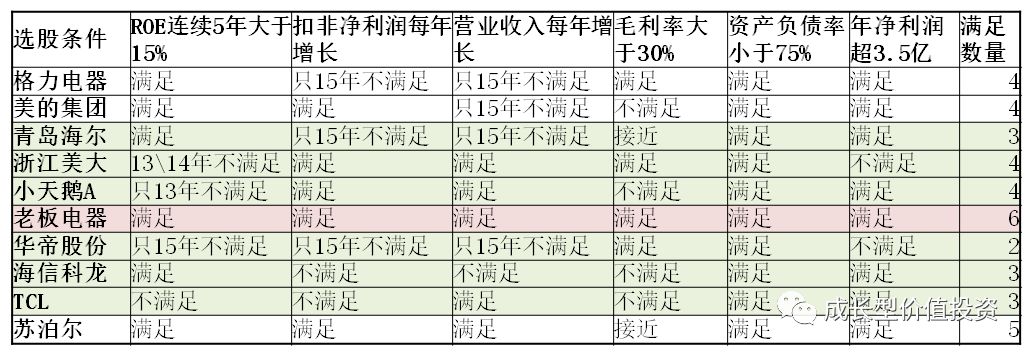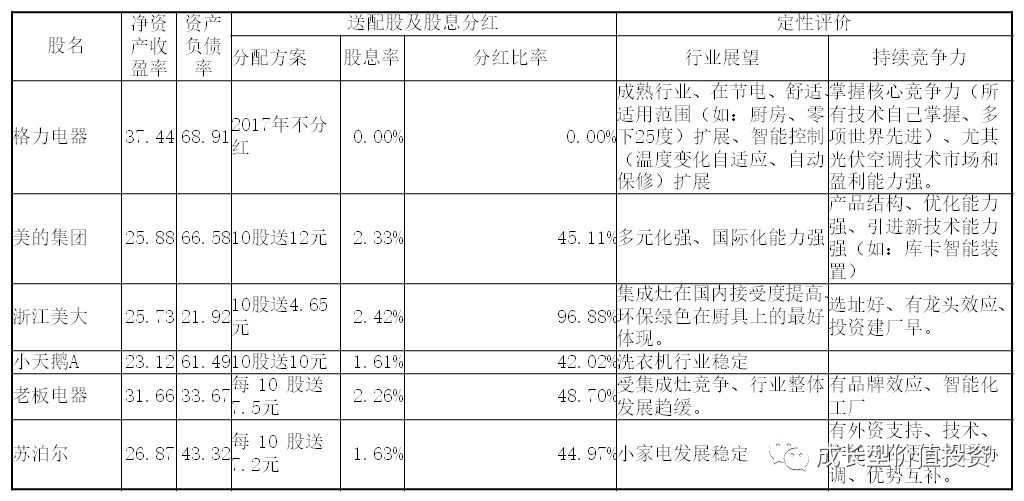 由於華帝股份、海信科龍、TCL和青島海爾滿足選股條件的項目較少,排除在《股票池》之外。華帝股份基本面還可以,只是年淨利潤總額不達要求、規模尚小隻能忍痛割愛。青島海爾毛利率較接近30%,其他條件與格力空調相同,相比之下寧願選格力電器。第一輪比較下來,格力電器、美的集團、浙江美大、小天鵝A、老闆電器和蘇泊爾進《股票池》。