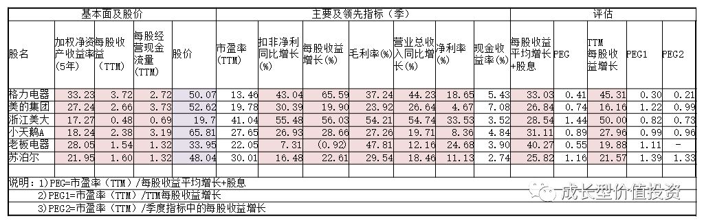 從表中可以看出從2017年4季度看老闆電器的每股收益負增長,該股票基本面很好,2017年4季度由於原材料漲價、房地產控制及網上銷量欠佳等原因業績表現差,也可能與集成竈產業的高速發展有關、先排除掉,觀察其業績變化。美的集團的PEG1爲1.04,表現爲2017年的利潤增長不如股票增長,但現金充裕、長期業績表現還比較好;蘇泊爾的PEG、PEG1和PEG2均大於1,說明從長期或年度或季度看,已處在估值合理區間而沒有被低估。總體上均不如格力。而格力電器不論從短期、中期和長期看均處在低估區,即買入的合理期。