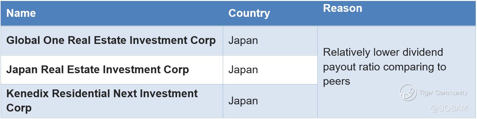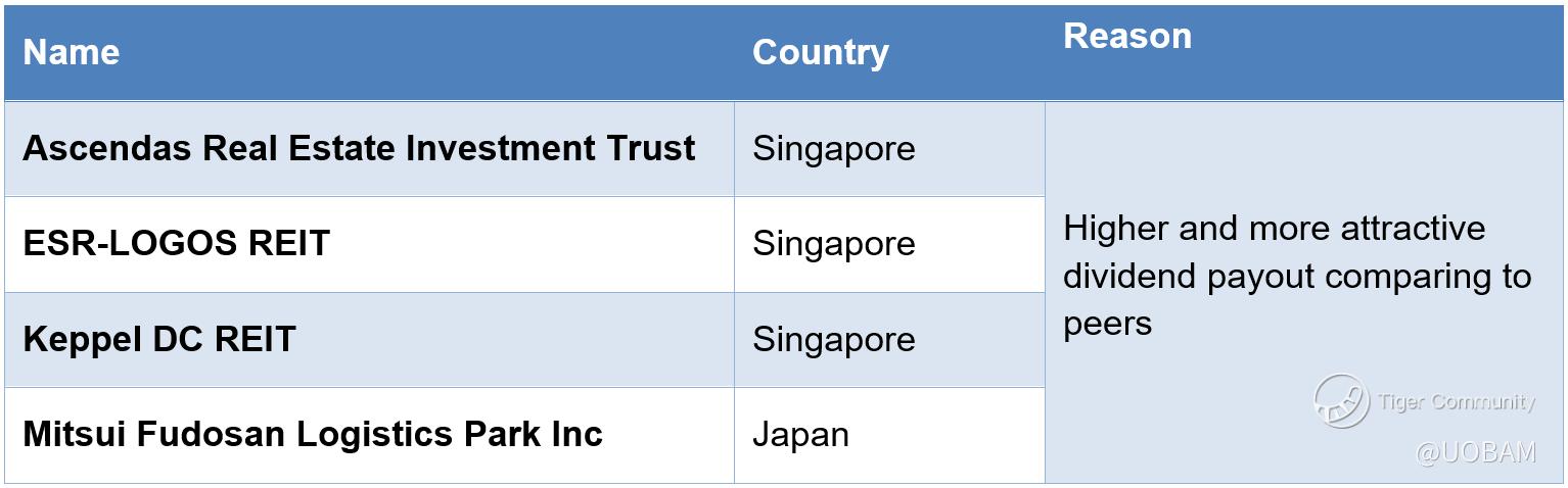 The Fund aims to have income distribution on a quarterly basis. Distributions in SGD are not guaranteed. Distributions may be made out of income, capital gains and/or capital. This relates to the disclosed distribution policy as set out in the Fund’s prospectus. Please refer to www.uobam.com.sg for more information. The ex-date of the latest dividend distribution was on26 September2022. When an Index review is conducted, all eligible REITs will be regrouped according to their market capitalization and re-ranked according to their 12-month trailing dividend yield. A basket of 50 REITs with higher dividend yields will be selected to form the holdings.