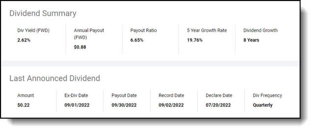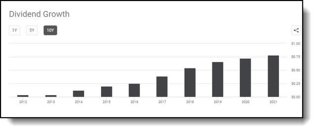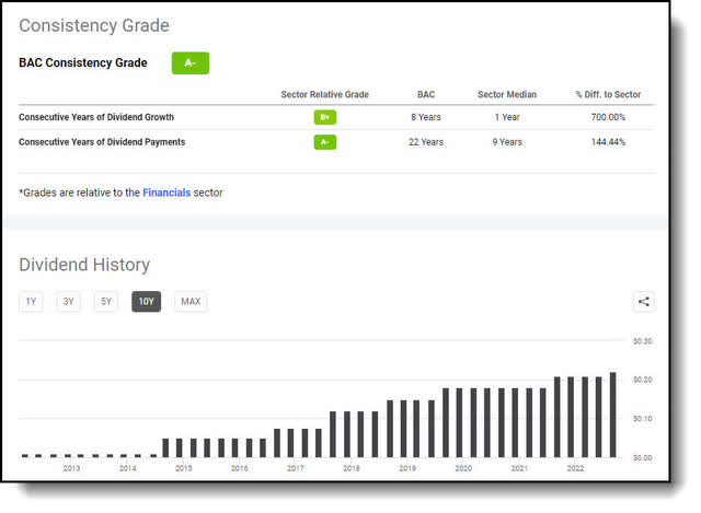 The dividend consistency grade is an A-, according to Seeking Alpha’s scorecard. 22 years of payments, 8 years of growth.