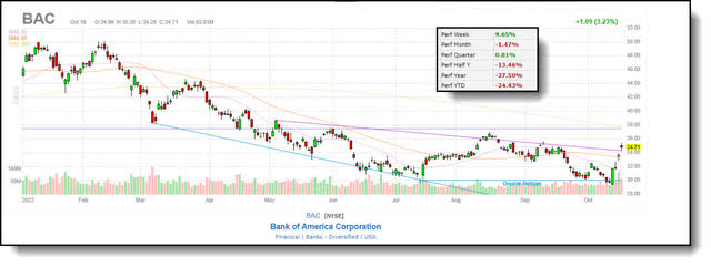 With BAC stock trading near its lows and fulfilling a double-bottom reversal pattern, the stock looks primed for a rally. Bank of America has sold off hard for the past year. The stock is down 27% from its 52 week high and 25% year to date. This has created a substantial buying opportunity for savvy investors, I’d say. It appears an initial breakout is underway. The stock looks technically solid here. Take a look the chart below.