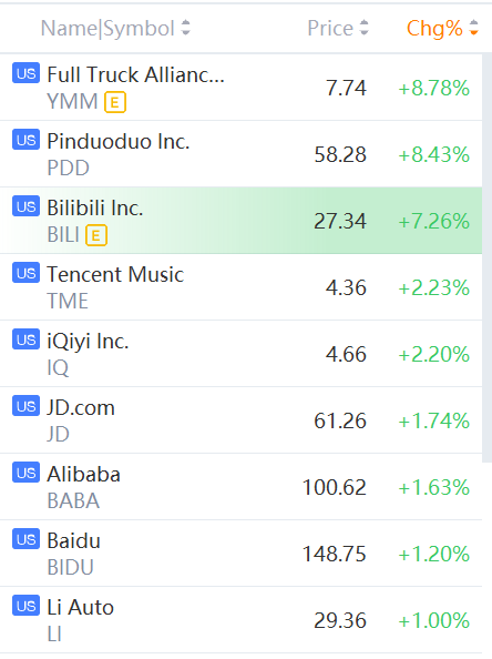 Alibaba, Pinduoduo, Baidu, Bilibili, Li Auto and Full Truck Alliance rise between 1% and 9%.