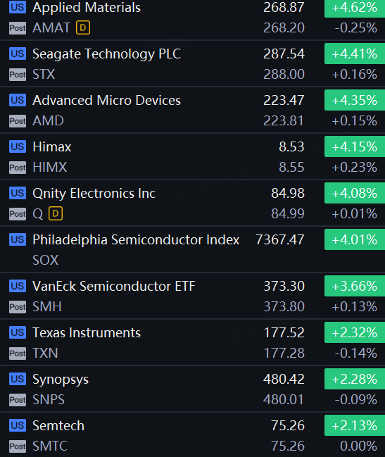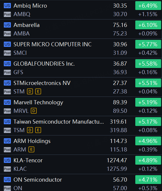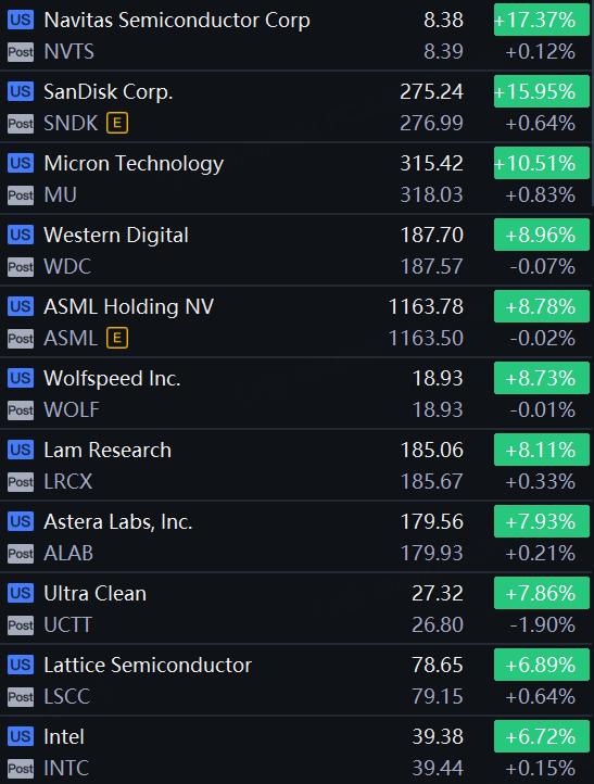 Chip stocks shined. Navitas up 17%; SanDisk up 16%; Micron up 11%; Western Digital, ASML up 9%; Intel up 7%; SMCI up 6%; Marvell, ARM and TSMC up 5%; AMD and Seagate up 4%; Nvidia up 1%.