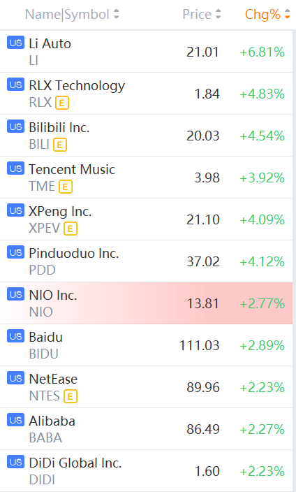 Alibaba, Baidu, Bilibili, DiDi, iQiyi, JD.com, Li Auto, Pinduoduo and XPeng rose between 2% and 7%.