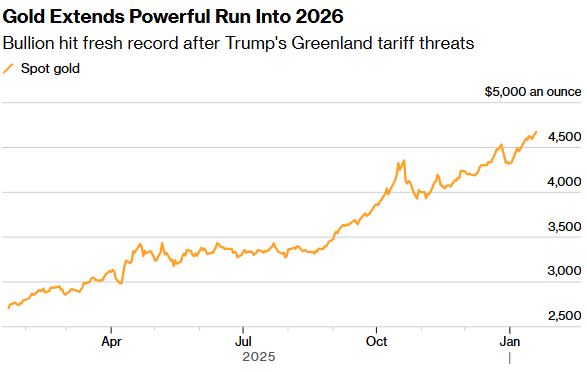 特朗普吞并格陵兰岛的举动引发的担忧,再次推动金价创纪录上涨,过去12个月金价累计上涨约70%。近几周来,随着地缘政治紧张局势加剧以及美联储独立性再次受到攻击,投资者纷纷涌入金市。