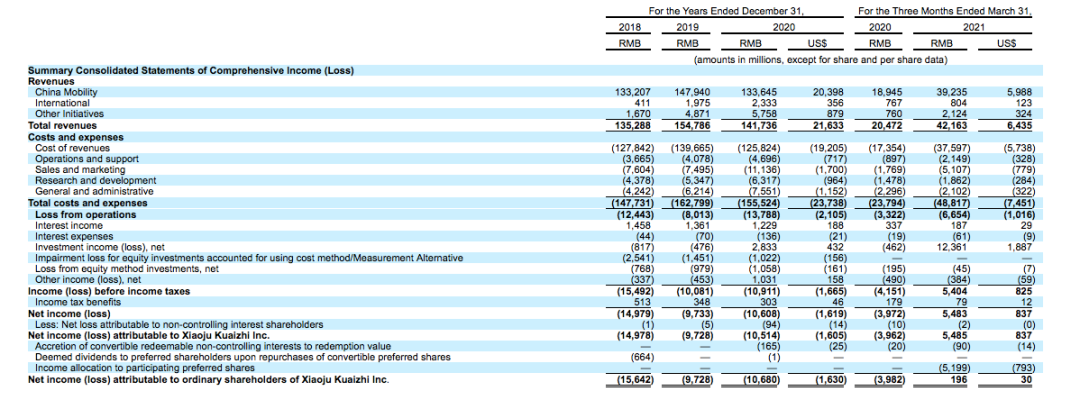 滴滴在2018年、2019年和2020年的净亏损分别为150亿元人民币、97亿元人民币和106亿元人民币(约合16亿美元);在截至2021年3月31日的三个月,公司的净利润为55亿元人民币(约合8亿美元)。