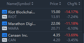 Crypto stocks tumbled in premarket trading,with Riot Blockchain falling over 7% and Marathon Digital sliding over 6%.