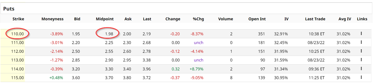 This shows that the $110 strike price put contract offers a $1.98 per contract premium. Here is what that means for a cash-secured put option short play.
