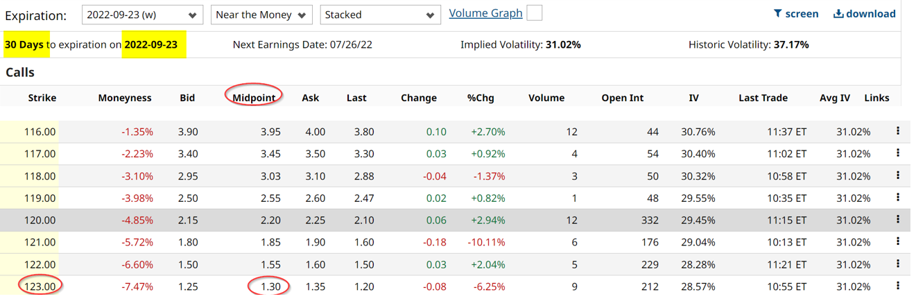 This shows that the one-month out Sept. 23 expiration call options at the $123 strike price, which is less than 7% over today's price offers a $1.30 call premium. Here is what that means to a covered call investor.