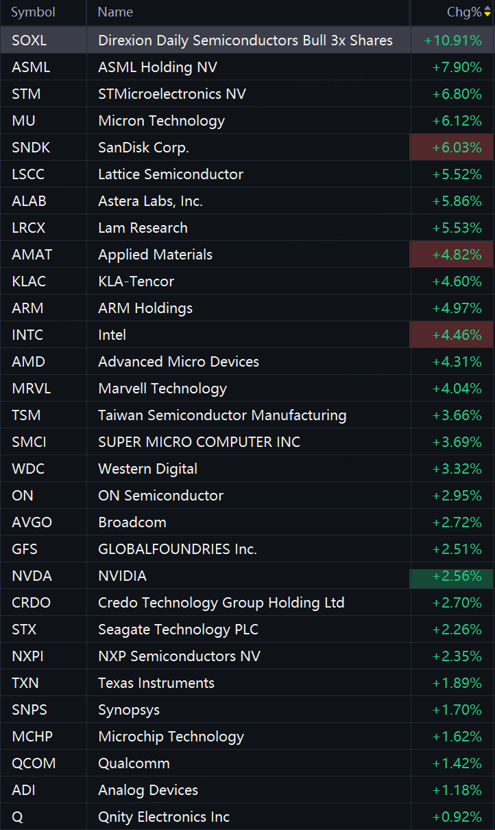 Semiconductor stocks jumped in morning trading. Direxion Daily Semiconductors Bull 3x Shares rose 11%; ASML rose 8%; STMicroelectronics rose 7%; Micron and SanDisk rose 6%; Arm and Intel rose 5%; AMD, Marvell Technology, TSMC, and Super Micro Computer rose 4%; Western Digital, Broadcom, and Nvidia rose 3%.