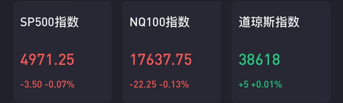 美股三大股指期货涨跌不一,截至发稿,道指期货涨0.01%,纳斯达克100指数期货跌0.13%,标普500指数期货跌0.07%。