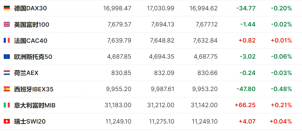 欧洲主要指数涨跌不一,德国DAX30涨0.20%,英国富时100跌0.02%,法国CAC40涨0.01%。