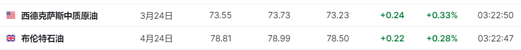 原油期货小幅走高,WTI原油报73.55美元/桶,涨0.33%;布油现报78.81美元/桶,涨0.28%。