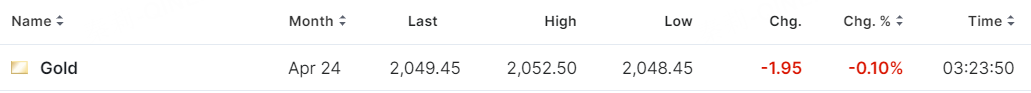 黄金期货走低,现跌0.10%,报2049.45美元/盎司。