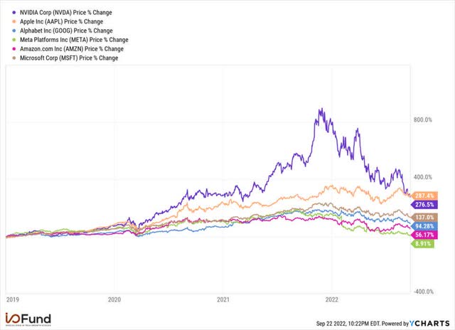 After 2018, although it took Nvidia eighteen months to reclaim its all-time highs, in 2020-2021, Nvidia would go on to stage a remarkable turnaround as the stock led tech mega cap stocks in gains. This was not simply because all tech performed well during those years – if you compare Nvidia to Meta (META), Amazon (AMZN) and Google (GOOG)(GOOGL), you’ll see something unique occurred with Nvidia that caused the stock to outpace its peers. In all cases except Apple (AAPL), Nvidia doubled, tripled or quadrupled the performance of other mega cap stocks.