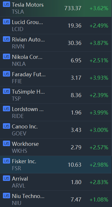 EV stocks climbed in morning trading. Tesla, Lucid, Rivian, Nikola, Faraday Future and Lordstown rose between 2% and 4%.