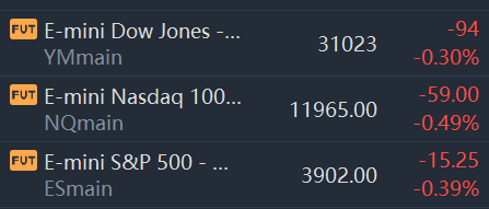 At 7:50 a.m. ET, Dow e-minis were down 94 points, or 0.3%, S&P 500 e-minis were down 15.25 points, or 0.39%, and Nasdaq 100 e-minis were down 59 points, or 0.49%.