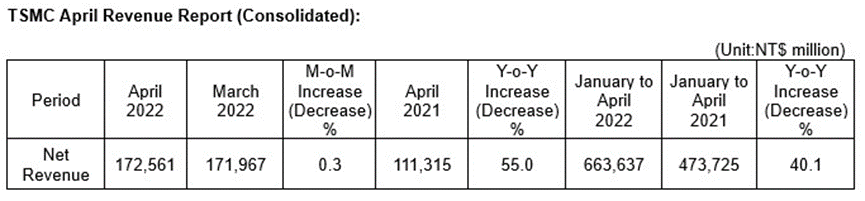 TSMC today announced its net revenue for April 2022: On a consolidated basis, revenue for April 2022 was approximately NT$172.56 billion, an increase of 0.3 percent from March 2022 and an increase of 55.0 percent from April 2021.