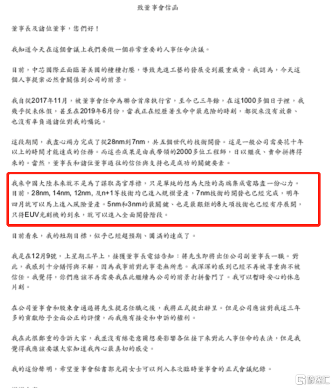 2020年12月,芯片界大咖梁孟松给中芯国际递交了一封辞职信(虽然后来他又出现在高管名单中),并在信中透露了一项重要信息:中芯国际7nm技术的开发已经完成,明年四月就可以马上进入风险量产。5nm和3nm最关键、也是最艰巨的8大项技术也已经有序展开,只待EUV光刻机的到来,就可以进入全面开发阶段。