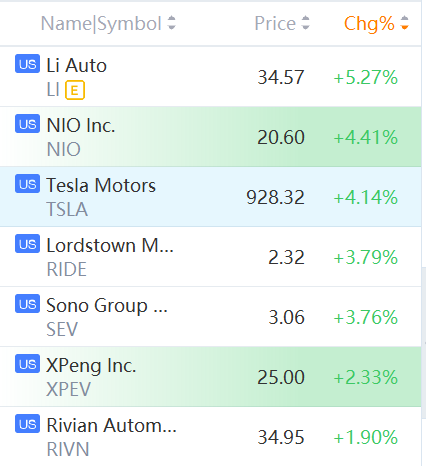 Rivian, NIO, Xpeng, Li Auto, Sono Group, and Lordstown rose between 1% and 5%.