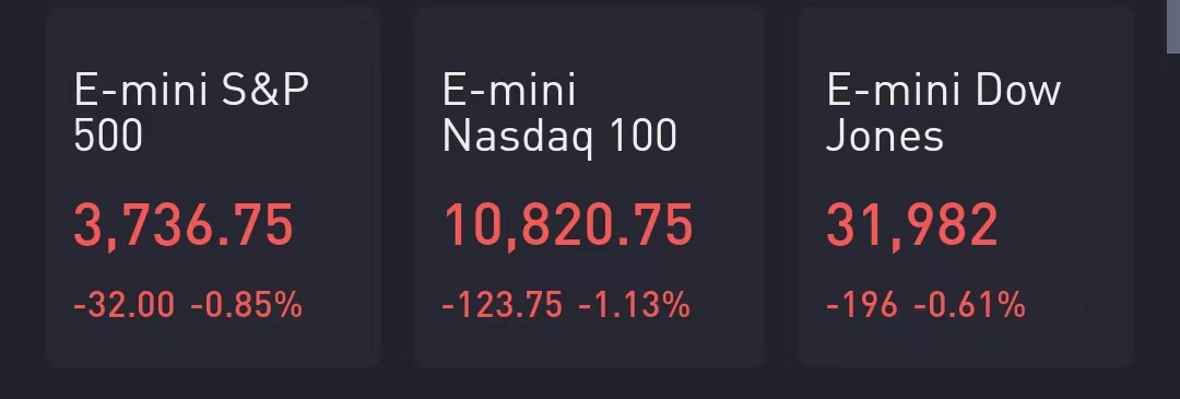 At 7:50 a.m. ET, Dow e-minis were down 196 points, or 0.61%, S&P 500 e-minis were down 32 points, or 0.85%, and Nasdaq 100 e-minis were down 123.75 points, or 1.13%.