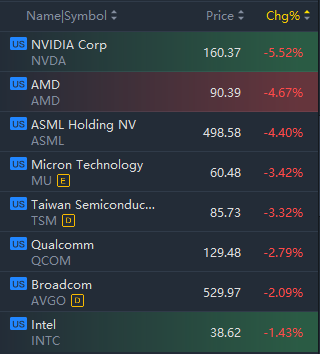 Semiconductor stocks slid in morning trading, with Nvidia and AMD falling about 5%.