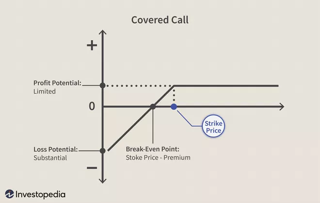 A covered call strategy involves buying 100 shares of the underlying asset and selling a call option against those shares. When the trader sells the call, the option's premium is collected, thus lowering the cost basison the shares and providing some downside protection. In return, by selling the option, the trader is agreeing to sell shares of the underlying at the option's strike price, thereby capping the trader's upside potential.