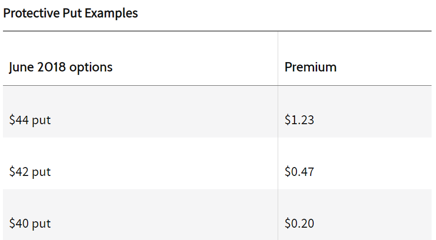 The table shows that the cost of protection increases with the level thereof. For example, if the trader wants to protect the investment against any drop in price, they can buy 10 at-the-money put options at a strike price of $44 for $1.23 per share, or $123 per contract, for a total cost of $1,230. However, if the trader is willing to tolerate some level of downside risk, choosing a less costly out-of-the-money (OTM)option such as the $40 put could also work. In this case, the cost of the option position will be much lower at only $200.
