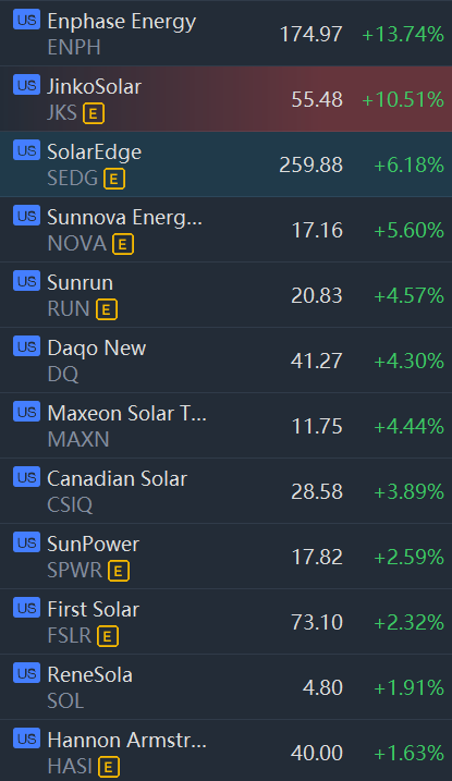 Solar stocks jumped in morning trading. Enphase Energy, JinkoSolar, Sunnova Energy, SolarEdge, Sunrun, Daqo New, Maxeon Solar Technologies and SunPower climbed between 2% and 14%.