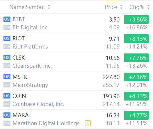 Crypto shares jumped in overnight trading. Bit Digital rose nearly 17%, Riot Platforms rose over 14%.