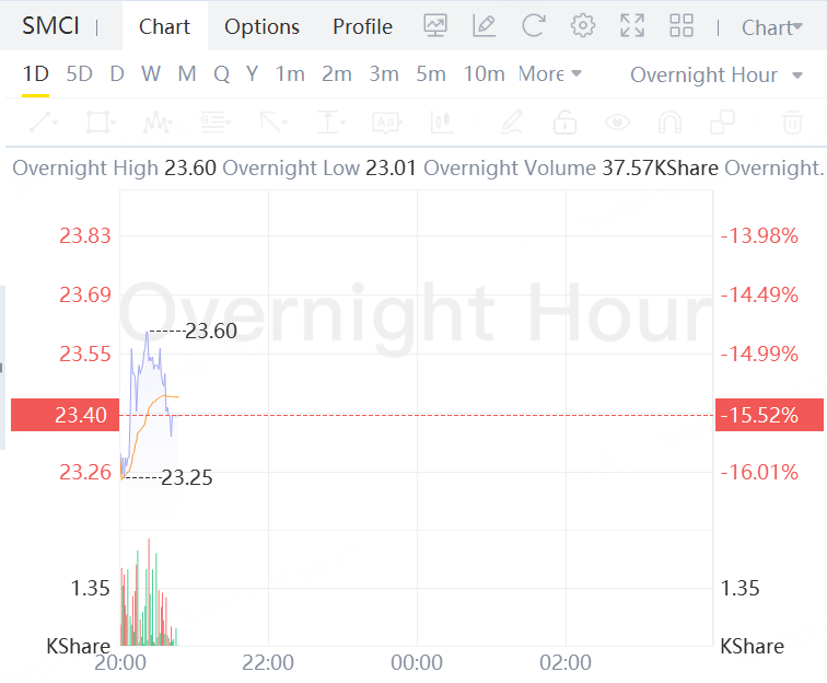 Shares of Super Micro Computer fell over 15% in overnight trading. Super Micro Computer, whose auditor unexpectedly stepped down last week, on Tuesday flagged uncertainty about the timing of its annual report but said a probe about accounting practices had not found evidence of fraud by the company.