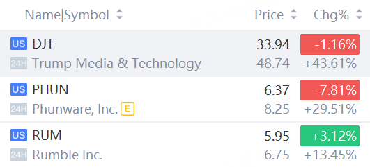 Trump-linked stocks jumped in overnight trading. Trump Media stock rallied 43% before suspending trades; Phunware rose over 29%.