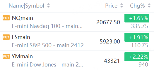 Trump claims victory in U.S. presidential election after two outlets project him as winner. S&P 500 futures were up 1.91%, while Nasdaq 100 futures were up 1.65%. Dow futures were up 2.22%.