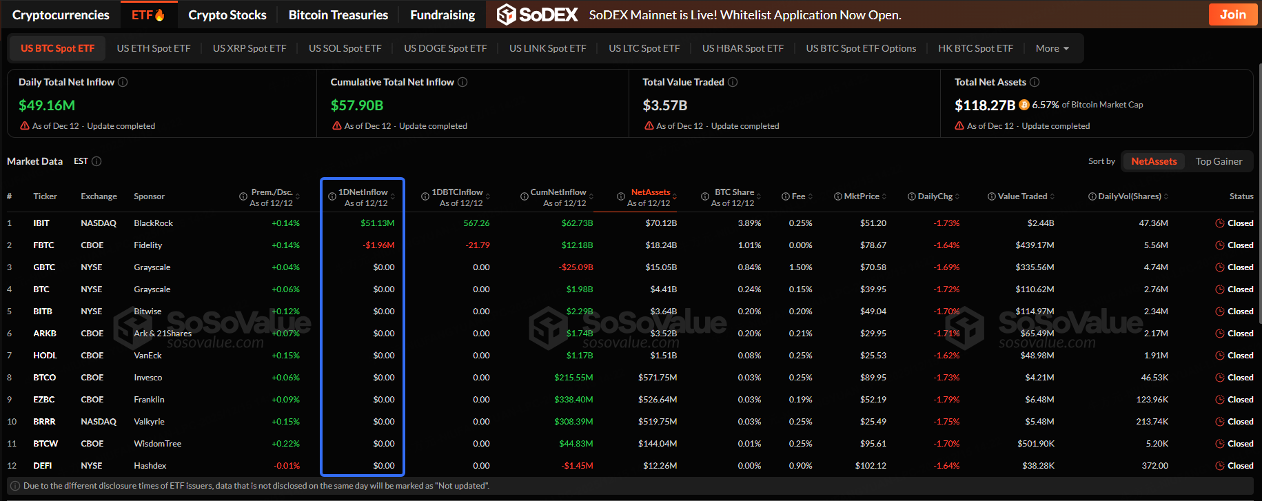 The Bitcoin spot ETF with the highest net inflow on Dec. 12 was iShares Bitcoin Trust ETF, with a net inflow of $51.13 million, according to SoSoValue.