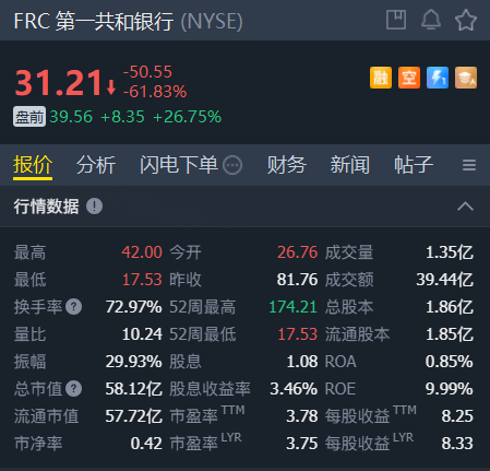 3月14日,周一暴跌超60%的第一共和银行盘前涨超26%。同时,阿莱恩斯西部银行涨13%,嘉信理财涨超5%。