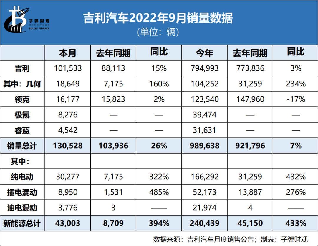 「子弹财观」从吉利汽车月度销量公告发现,吉利9月的广义新能源车型(包含:纯电动、插电混动和油电混动)销量为4.30万辆,同比增长394%,占总销量的32.95%;前三季度新能源车型累计销量为24.04万辆,同比增长433%,占总销量的24.30%。对于一家年销百万辆的大车企而言,突然出现四倍增速,显然是不太符合常理的。在拍手叫好的同时,也该清醒地认识到吉利新能源汽车在去年的基数之低,如此才会出现高增长。足见其新能源的起步之晚。