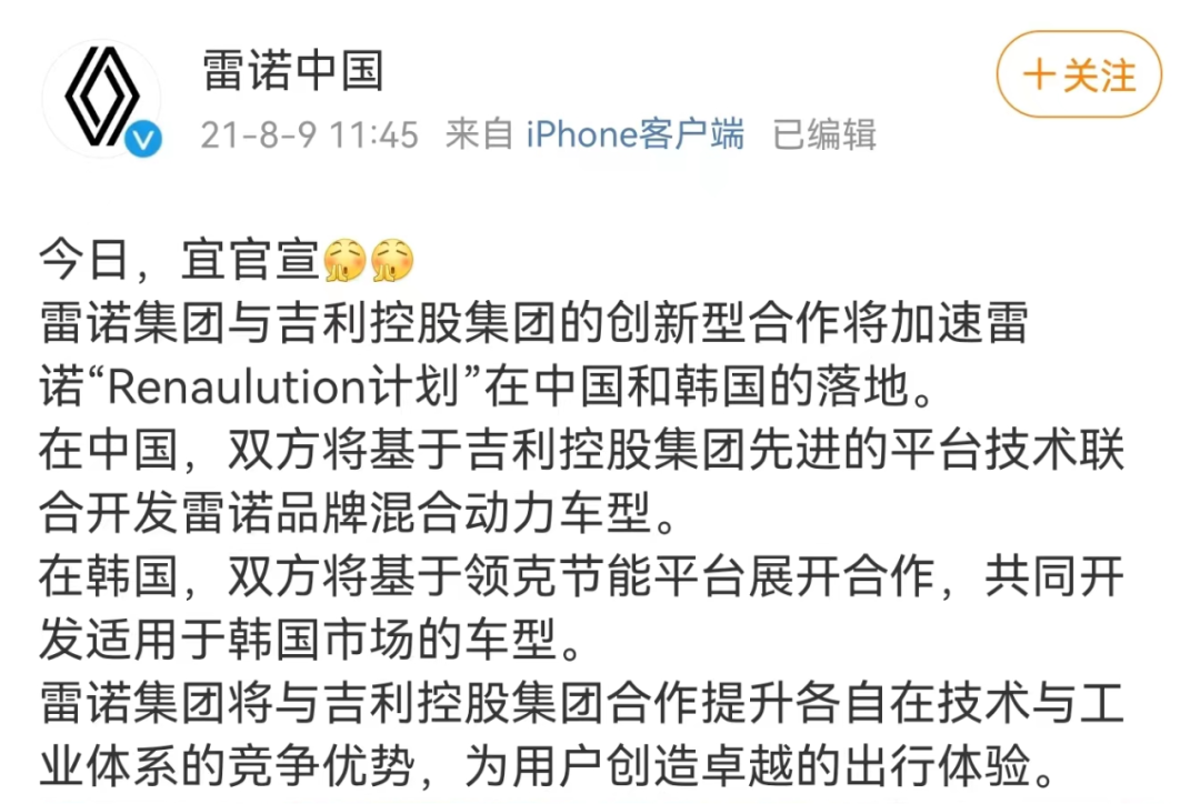 一旦雷诺将内燃机业务顺利地卖给了吉利,燃油车大户日产的市场份额必将受到侵蚀,而拥有雷诺燃油机技术的吉利或许将成为这笔买卖背后的最大赢家。图 / 雷诺中国官方微博