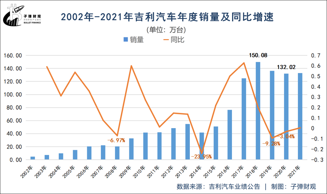 若是从过去的20年来看,吉利汽车自2000年首辆车的量产时间算起,在经历了长达19年的高增长后,于2018年以150.08万辆的年销量并创下了历史新高。随后便出现了明显的下行走势,并连续三年在年销130万辆的水平线上停滞不前。