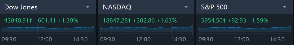 The Dow Jones Industrial Average rose 601.41 points, or 1.39%, to 43,840.91, the S&P 500 rose 92.93 points, or 1.59%, to 5,954.50 and the Nasdaq Composite rose 302.86 points, or 1.63%, to 18,847.28.