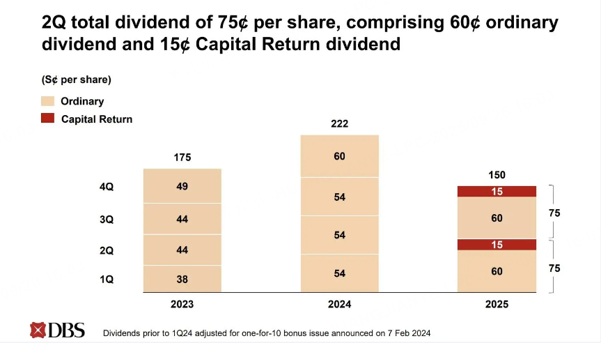 Following a special dividend payment in 2017 that initially seemed like a singular event, DBS has consistently enhanced its dividend distributions. The bank announced a quarterly increase of six cents in 2023, representing an annual boost of 24 cents. During the second quarter of 2025, DBS distributed a core dividend of 60 cents per share quarterly, alongside a 15-cent capital return dividend, bringing the first-half 2025 total payout to $1.50, equivalent to $3 annually. This represents approximately a 6% dividend yield based on the $50 share price.