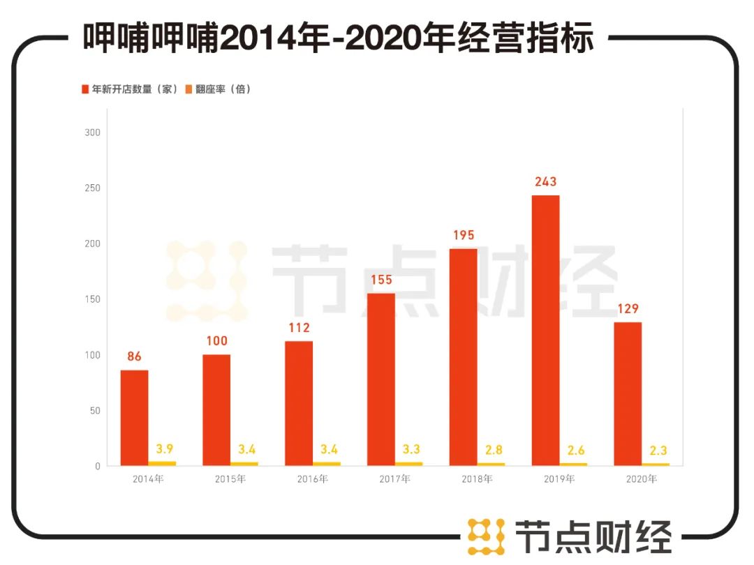 2014年至2020年,呷哺呷哺的翻座率分别为3.8倍、3.4倍、3.4倍、3.3倍、2.8倍、2.6倍、2.3倍。